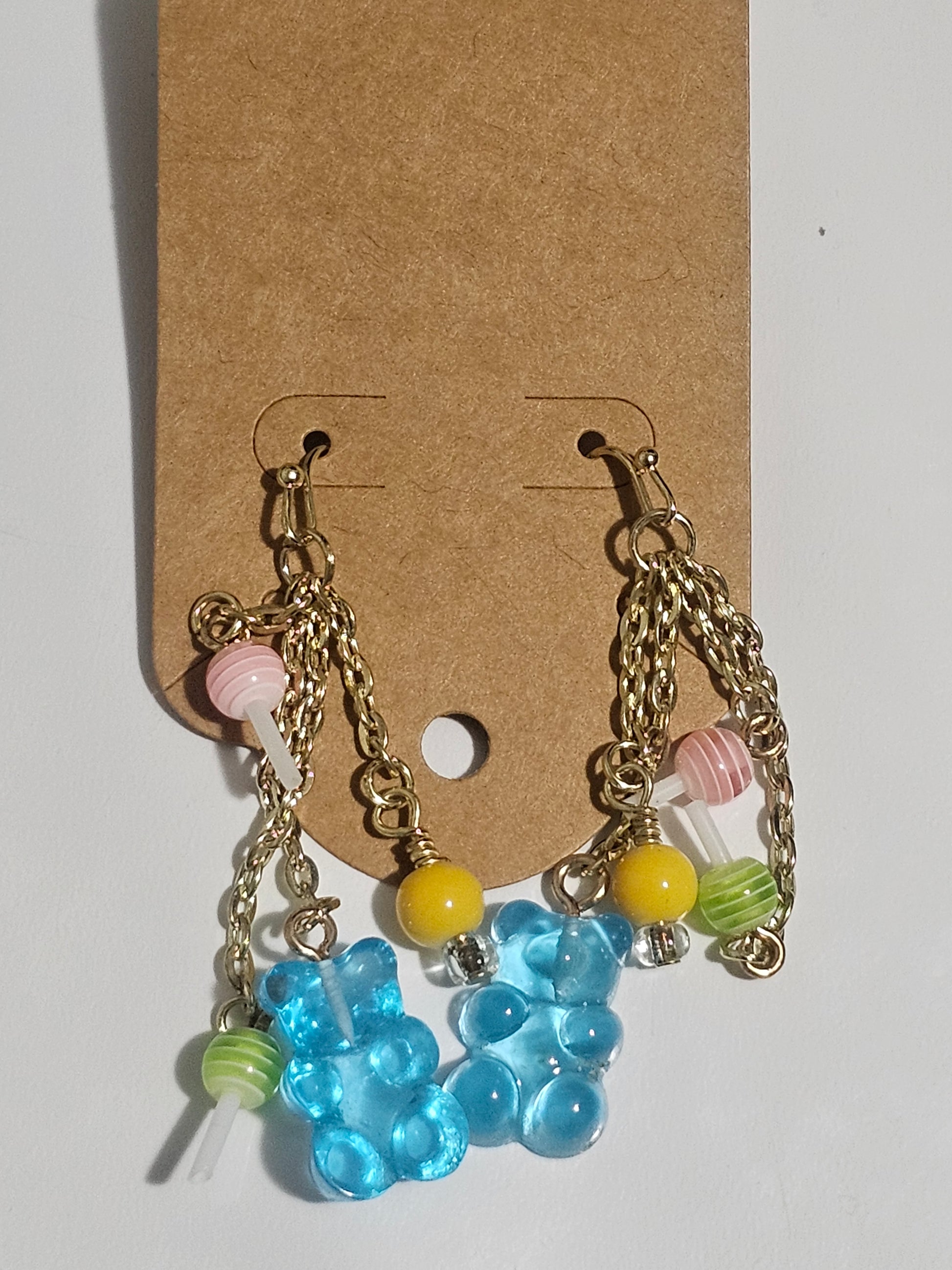 A pair of cute dangly earrings with gummy bears and lolipops, handmade.